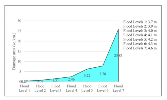 Figure 5 shows the estimation of the damaged areas that coincide with the water level in Chiang Mai. It indicates that the water level and the number of affected areas formed a direct relationship in that as the water level increased, the number of the affected areas also increased, and vice versa (Figure 5). High amounts of water flowing in streams, consequently increasing the water depth and water pressure, often lead to flooding.