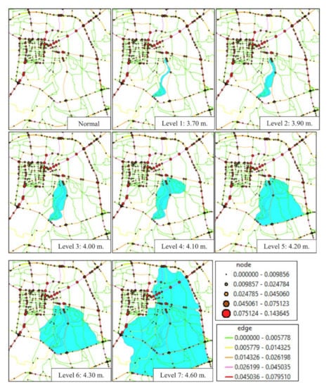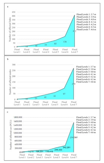 Moreover, the application of edge- and node-betweenness centrality models showed that the number of affected links (Figure 7a), nodes (Figure 7b), and cars (Figure 7c) also increased according to the rising water level.