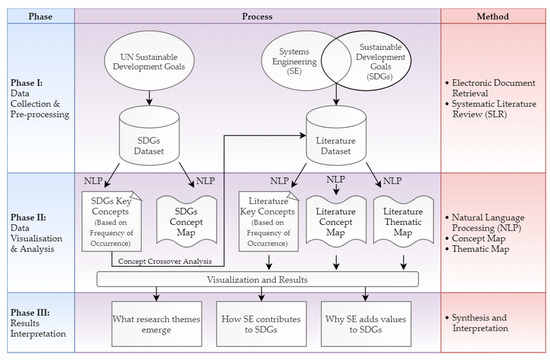 In order to address these deficits, our paper presents a scoping study that identifies existing synergies between systems engineering and the SDGs and helps build a foundation for future research directions. Whereas there are various methodological approaches for scoping studies [15], we focused on the most cited ones [16,17,18] and tailored them to our needs. Furthermore, we integrated natural language processing (NLP) [19] and systematic literature review (SLR) [20] in the process to pursue and ensure a rigorous and transparent method for synthesis and analysis. We adopted a three-phase analytical approach, namely (1) data collection and pre-processing, (2) data visualization and analysis, and (3) results interpretation. NLP is used in the first two phases and the principles of the SLR guides us throughout the study.