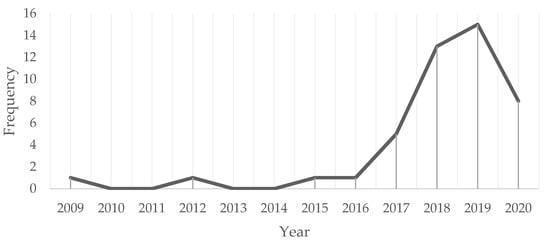 A total of 45 academic articles that focus on systems engineering and the SDGs were identified through the search and initial review, including 35 journal articles, 6 conference papers, and 4 book chapters. Publication per year generally followed an upward trend (as shown in Figure 2), with only 1 paper published in 2009, 2012, 2015, and 2016, respectively, 5 papers in 2017, 13 papers in 2018, and 15 papers in 2019. Since this time, the numbers have decreased marginally, with 8 published in 2020.