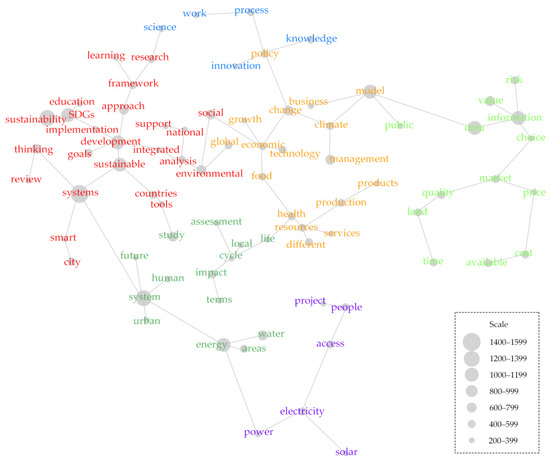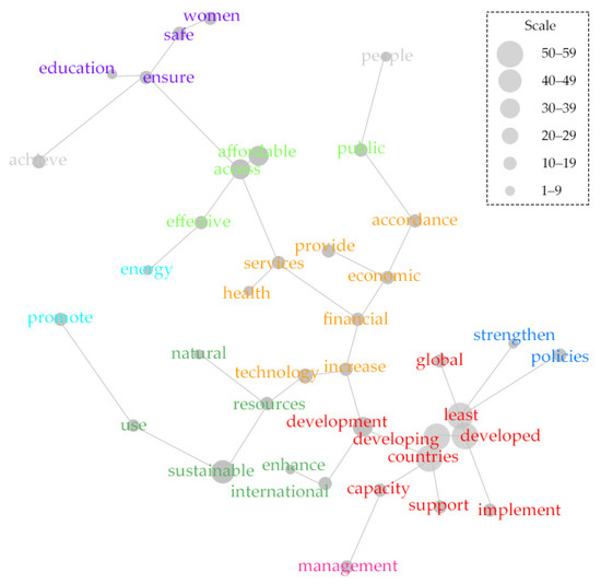 In Figure 3, the size of the dots represents the frequency of occurrence (the larger the dots, the higher the frequency). The length of the lines linking the dots represent the co-occurrence of two concepts in the corpus (the shorter the distance, the more often they co-occur in a sentence). As the generation of the concept map is based on how often two concepts travel together in the SDGs text and how closely they are to each other, we can use the concept map to present whether two concepts are mentioned together repeatedly in the same context. As a result, several clusters were constructed represented by the same color in Figure 3, where the concepts gather and become a theme.