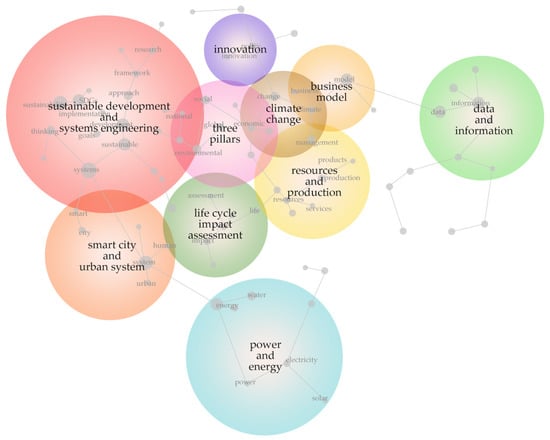 In Figure 5, we found that the literature contains several themes, such as sustainable development and systems engineering (including systems thinking, approach, framework, etc.), smart city and urban system, life cycle impact assessment, climate change, business model, research that is relevant to the three pillars, innovation, resources and production, power and energy, as well as data and information. The results obtained from the NLP analysis of the literature help us to understand the general research foci and trends. They offer a bird-eye view of the extant literature that focuses on using systems engineering to advance sustainable development.