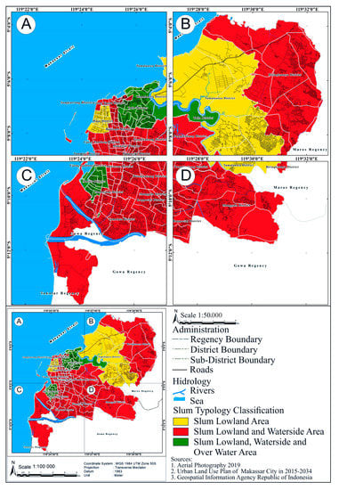 The locations of the slum settlements in Makassar City as the research object. (A) Slum in the city center; (B) Slums in an industrial area; (C) Slum in the center of business activities; (D) Slum settlements in suburban.
