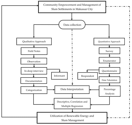 Departing from the focus and purpose of this study, it provides an illustration that the slum settlements in Makassar City tend to increase, due to urbanization. Thus, the research approach chosen in this study is a combination of quantitative and qualitative approaches, namely research that prioritizes the quality of data carried out through the identification process of social situations related to the cases studied, namely community empowerment, based on the use of renewable energy in handling slum areas. This study was aimed at examining and analyzing (1) community empowerment works as a determinant of the use of renewable energy in slum management and (2) the effect of community empowerment, utilization of renewable energy, strengthening of institutional capacity, and productivity of economic enterprises on improving environmental quality. These two things will be studied in depth, in detail, and holistically. Furthermore, a case study was selected in this study, with the following considerations: (1) The slum settlements that have developed in Makassar City are specific and complex due to urbanization; (2) the context of the slum settlements in Makassar City has a prominent consistency and sequence; and (3) the nature of the case is intended to understand and describe the mechanism for implementing community empowerment based on the use of renewable energy in handling slum areas.