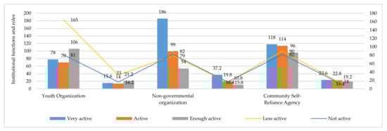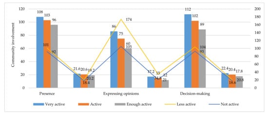 Figure 7 shows community participation in the implementation of social empowerment in handling activities of slum settlements in Makassar City. Three interpretations that can be proposed regarding these results are, among others, (1) community involvement, in terms of attendance for each activity, which shows that 42.2% are in the active category, 19.2% are in the active category, and 38.6% are in the less active category; (2) involvement, in terms of conveying thoughts and opinions, which shows 32.2% in the active category, 12% in the moderately active category, and 55.8% in the less active category; and (3) community involvement, in terms of decision-making, which shows that 42.8% are in the active category, 17.8% are in the moderately active category, and 39.4% are in the less active category. These results confirm that the role of society in social empowerment is not optimal. The field facts found illustrate that the inadequate implementation of social empowerment in handling slum settlements is more due to the level of understanding and awareness of the community to participate in solving social problems faced. The community will participate in improving the quality of the environment if the status of land ownership, shelter, and social problems faced are facilitated by government policies [96]. Furthermore, community involvement in empowering economic enterprises is presented in Figure 8, below.