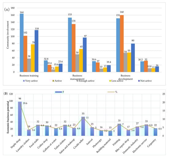 Figure 8A shows community involvement in the implementation of economic empowerment. Three interpretations that can be put forward in relation to these results include (1) community involvement in the implementation of economic business training, which is 53.2% in the active category, 7.6% in the fairly active category, and 32.9% in the less active category; (2) community involvement in business management, which is 57.6% in the active category, 10% in the fairly active category, and 32.4% in the less active category; and (3) community involvement in the development of economic enterprises, which is 62.2% in active category, 10.8% in the quite active category, and 17% in the less active category. These results confirm that the public’s interest in improving welfare through economic business development is quite positive. Thus, the potential for economic business that is developed by the community requires the support of government policies in the form of implementing strategic programs through the use of social capital built up in the community. That is, it is very important to understand social capital as the glue of social relations for the community and as the basis for the formulation of investment-based programs in community organizing [97]. The field facts we found illustrate that the economic business developed by the community is an effort to maintain its existence in the dynamics of urban development, so that it has the opportunity to be developed to reduce unemployment and poverty in Makassar City. The vital function of city governments is to provide infrastructure and facilities that are easily accessible and enable communities to solve problems independently through strengthening capacity, increasing skills, building cooperative networks, and developing economic enterprises [98,99].