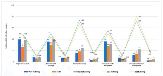 Figure 8B shows the economic enterprises developed by the community in the slum areas of Makassar City. The dominant economic businesses are (1) food stalls, at 19.6%, (2) credit sales, at 11%, (3) printing businesses, at 7.4%, (4) 6.4% for the categories of food stalls and clothing tailors, and (5) 6.6% for the electronic service business category. The differentiation of developing economic enterprises shows that the capacity of business capital and the interests of community businesses vary considerably. The results of the field confirmation illustrate that the economic business developed by the community is still limited to maintaining the existence and ensuring the survival of the family, both individually and in groups as a community unit. Thus, it takes initiative and synergy between the city government and the community in the form of strategic steps to address the problem of slum settlements [100,101].