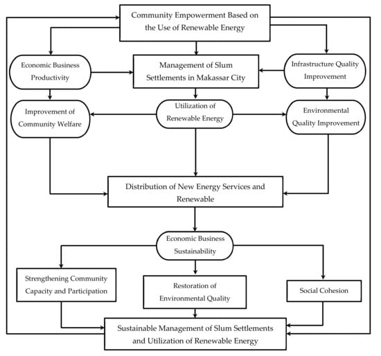 Utilization of renewable energy through empowerment, followed by strengthening the capacity of the community in slum settlements in Makassar City, will not only encourage increased community economic productivity but also have an impact on improving environmental quality. The consumption of renewable energy has a positive impact on socio-economic development toward improving economic, institutional performance and minimizing the threat of environmental damage, both in the short- and long term [21,22]. Furthermore, community economic management through the use of renewable energy, which is carried out with an empowerment-based approach and community participation, is aimed at building ownership, in the sense of optimizing the use of renewable energy, such as solar power, water, wind, and biomass energy, and will have an impact on economic growth and increase in income, as well as the sustainability of community economic enterprises. Utilization of the main renewable energy sources—solar, wind, and biomass energy, which is integrated, will have an impact on meeting local energy needs [23].