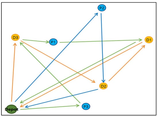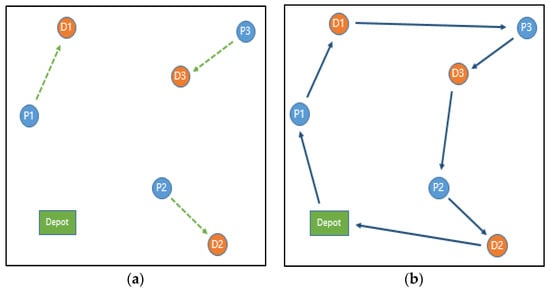 The transportation vehicle in the troop movement procedure is similar to that of the PDP, which was designed to determine a route and schedule for pickup and delivery requests between origin and destination pairs [11]. In the PDP, the route of the transportation vehicle satisfies the precedence, pairing, capacity, maximum route time, and time window constraints. The precedence constraint means that a vehicle visits the origin before moving to a destination, and a pairing constraint is used so that the customer’s pickup and delivery request is fulfilled by the same vehicle [45]. Figure 2 shows an example of requests and a vehicle route that satisfies the precedence and pairing constraints.