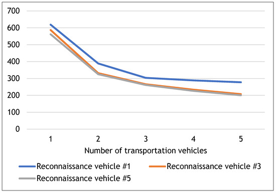 Table 11 shows the sensitivity analysis results for Case 2, and Figure 6 features graphs showing the average results of Case 2: As the number of reconnaissance vehicles increased, the completion time for troop movement also decreased. However, the rate of change of completion time for the troop movement did not change significantly when the number of reconnaissance vehicles was increased.