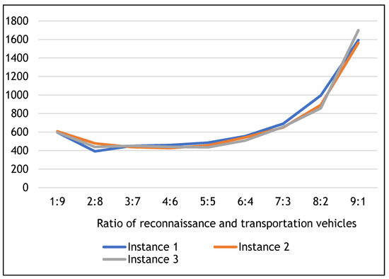 The second experiment was a sensitivity analysis related to the changing number of vehicles. The change in the number of vehicles can be divided into three cases: (1) the number of reconnaissance vehicles remained constant and the number of transportation vehicles changed, (2) the number of transportation vehicles remained constant and the number of reconnaissance vehicles changed, and (3) the total number of vehicles remained constant and the ratio of reconnaissance to transportation vehicles changed. The ACO algorithm was used for sensitivity analysis. Data sets and parameters for this experiment were randomly generated. Cases 1 and 2 each featured 21 nodes, and the Case 3 featured 51 nodes. The computational experiments for the sensitivity analysis were limited to 300 s.