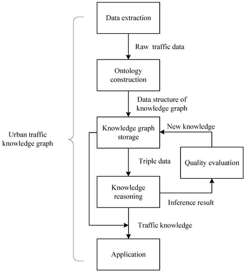 The construction process of a knowledge graph is essentially a process of obtaining the required data and organizing said data into a whole in an appropriate form and method. The construction process of a knowledge graph is an iterative update process. First, it is necessary to rely on crawler technology to collect open traffic field data and to extract entities, attributes, and relationships from it. Second, the pattern layer of a knowledge graph is designed and completed, that is, the traffic field ontology is constructed. Then, the data layer of a knowledge graph is stored in the graph database. After that, knowledge reasoning is performed based on the existing data in a knowledge graph, carrying out quality evaluation of the inference results (such as contradiction and redundancy checks), thereby expanding and enriching a knowledge graph. The research framework of this paper is shown in Figure 1.