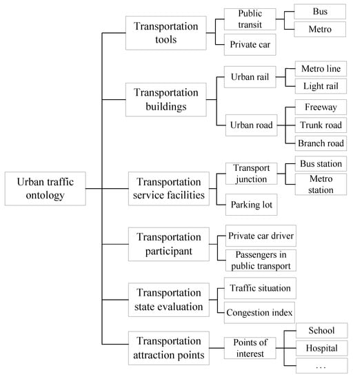 The field of urban traffic was divided into six categories, including traffic tools, traffic buildings, traffic service facilities, traffic participants, traffic state evaluation, and traffic attraction points. Each category was divided into multiple subcategories and organized in a hierarchical structure. The hierarchy of the ontology classes in the urban traffic field is shown in Figure 2.