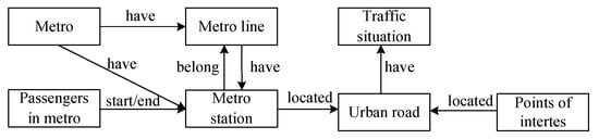 There are some relationships in the urban traffic ontology, and two classes are connected through such a relationship. For example, the location of a certain point of interest is on a certain road, and the relationship between the point of interest and the city road is located. Figure 3 shows the relationships between all of the classes in the urban traffic ontology.