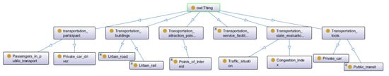 This paper used the ontology editing tool Protégé to complete the construction of the ontology in the urban traffic field, as shown in Figure 4. Protégé is an ontology editing and knowledge acquisition software developed by Stanford University based on the Java language. It provides good support in terms of visualization, query, and storage [39].