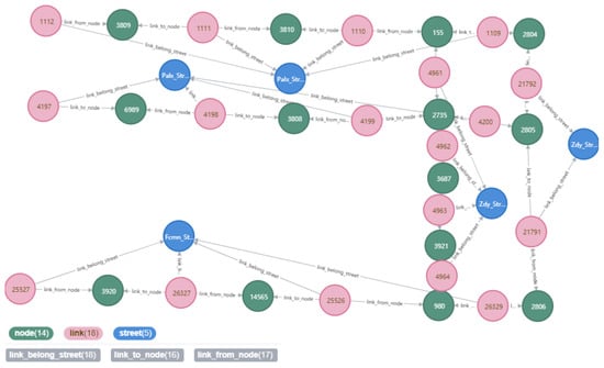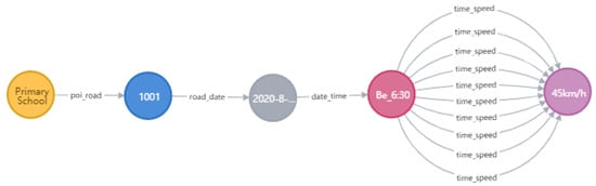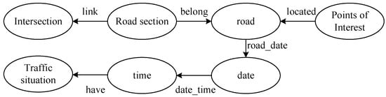 According to the acquired road data, points of interest information (primary and middle schools), and traffic situation data of the area within the Fifth Ring Road in Beijing, the entities, attributes, and relationships between entities were extracted to construct a knowledge graph of urban road traffic. The entities included urban roads, points of interest, and traffic situations in the domain ontology, and entities representing spatio-temporal relationship data, such as date, time, intersection, and road section, were added. Figure 6 shows the entities included in the urban road traffic knowledge graph and the relationships between the entities.