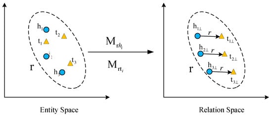 The word2vec word representation learning method proposed by Mikolov et al. found that there is a translation invariance phenomenon in the word vector space [29]. Bordes et al. [30] were inspired by this and proposed the first translation model, TransE. The entities and relationships in this model are represented by a single vector, which cannot accurately describe complex relationships such as reflexivity, 1-N, N-1, and N-N. Therefore, many models have been improved and extended on the basis of this model. For example, the TransH model [31] proposes to project the head entity h and the tail entity t into the corresponding hyperplane of the relationship r. The translation operation better solves the problem of TransE’s poor effect in dealing with complex relationships, but it does not break the assumption that entities and relationships are in the same space. Therefore, the TransR model proposes to project the head entity h and the tail entity t into the corresponding relationship space of the relationship r, and to realize the translation operation from the head entity to the tail entity in the relationship space [32]. The CTransR model is based on the TransR model. First, the head and tail entity pairs are grouped by clustering, and different relationship vectors are learned for each group to make the projection expression more accurate. However, due to the introduction of the projection matrix, the model parameters have increased sharply, and the computational complexity has also greatly increased. Therefore, Ji et al. proposed a method of dynamically constructing a projection matrix—the TransD model [33], which takes into account the interaction between entities and relationships and defines the projection matrix of the head and the entities in the relationship space, respectively.