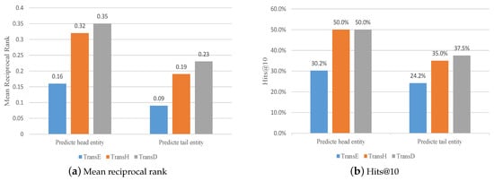 Regarding the public traffic knowledge graph data set constructed in this paper, the results of the different models on the link prediction task were compared. Table 12 shows the results of predicting the head and tail entities. In order to facilitate a comparison, the optimal value of each evaluation index is marked in bold, and a bar chart was drawn with the MRR and hits@10 indicators as representatives, as shown in Figure 9, which can intuitively compare the performance of each model.