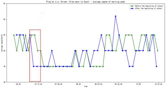 Comparison of the average speed during the morning peak hour on Ping’an Lixi Street before and after the beginning of school.