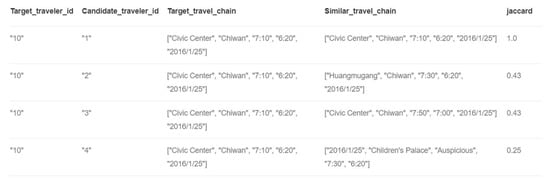 The similarity calculation results between the commuter travel chains.