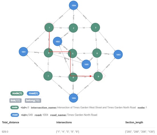 The urban road traffic knowledge graph constructed in this paper included the topological structure of the road network and the length information of the road sections. Thus, it can use the Dijkstra algorithm in the path search algorithm to find the shortest distance path between two nodes, and can provide a data basis for route planning services of traffic. As shown in Figure 13, where the intersection numbered 1 was taken as the starting point and the intersection numbered 9 as the end point, the path with the shortest distance between the start and end points was found and is marked with a red line in the figure.