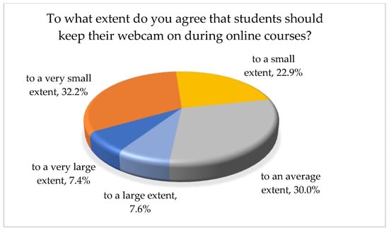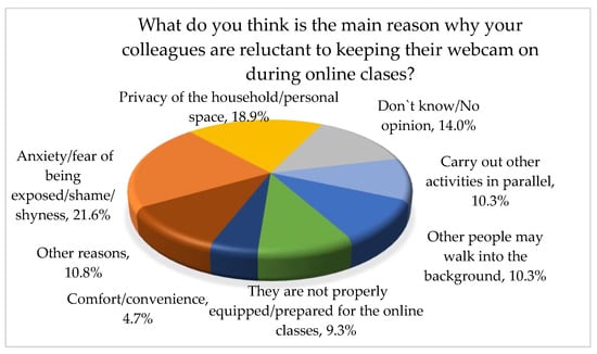 Interestingly, before the COVID-19 pandemic and the universities’ shutdown, students used their webcams when attending online courses, as several studies have emphasised [32,33,34]. Others have identified the reasons behind students’ choices not to turn on their webcams as shyness, self-disclosure [35], lack of perceived reason [36], or the sensation that someone is intruding into their privacy [37].