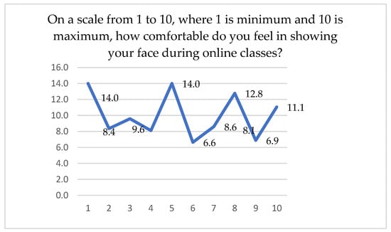 To capture how comfortable students feel in showing their faces during online classes, a 10-step scale question was introduced in the questionnaire, where 1 represented the minimum degree of comfort, and 10 represented the maximum. An average value of 5.37 and a distribution of responses were recorded, the latter being shown in the graph below (Figure 2). The highest percentage values were recorded for ratings 1 (14.0%) and 5 (14.0%), followed by ratings 8 (12.8%) and 10 (11.1%). Compared to the central point of the scale (rating 5), a uniform distribution of responses was recorded in the sense that relatively similar percentages were recorded for those who feel comfortable in front of the webcam and those who do not.