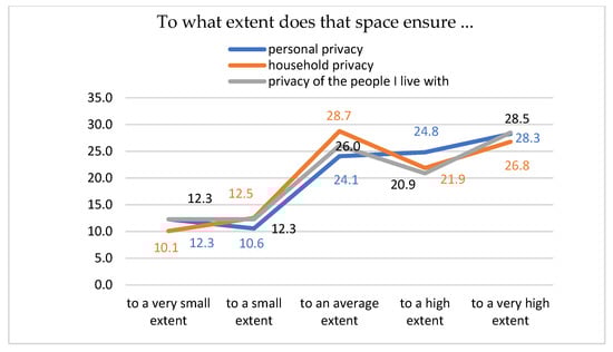 The environment/space used by students to participate in educational activities is very important. Our study results demonstrated that 60.7% of the students have a specially designed place inside their homes, which is used only by them to participate in online classes. As can be seen from the figure below (Figure 5), for most of the respondents, space provided, on average and above average, the household privacy and the privacy of the people they live with. The category of those who stated that these characteristics are provided “to a small or very small extent” was less than one-quarter of the whole sample.