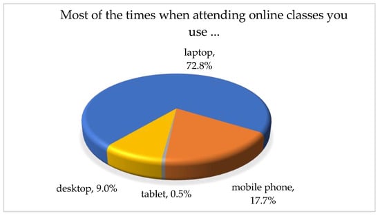 As can be seen from the figure below (Figure 6), most students used a laptop (72.8%), a mobile phone (17.7%), or a desktop (9.0%) to participate in online classes. A tablet was used by only 0.5% of students. Even though the mobile phone is considered an inappropriate device for attending online courses in the technical field, primarily due to the small screen size, an unexpected high percentage of students regularly used their mobile phones to attend classes. A possible explanation for this could be the fact that they do not possess any other device, the mobile phone being the only tool that allows them to participate in online educational activities.