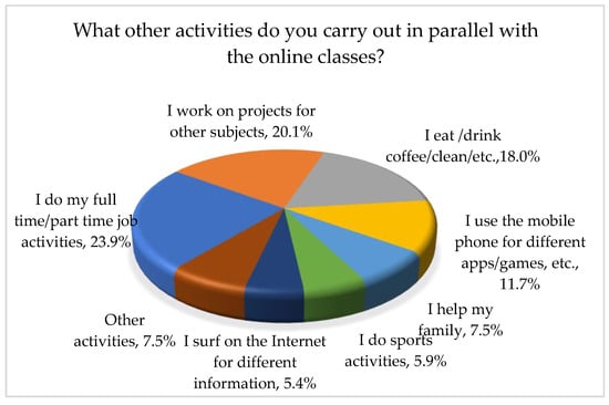 More than half of the questioned students (54.1%) stated that they carry out other activities in parallel with the online classes. To the open question “what other activities do you carry out in parallel with the online classes?”, most of the respondents stated that they have a full time/part-time job (23.9%), that they work on projects for other subjects (20.1%), or that they eat/drink coffee/clean (18.0%). The list was completed by other activities such as using a mobile phone for various applications/games, etc. (11.7%), helping the family (7.5%), sports activities (5.9%), or searching for information on the Internet (5.4%). (Figure 7). It is worth highlighting that these percentages were calculated from those who stated that they carry out other activities in parallel with the online classes and not from the entire sample.