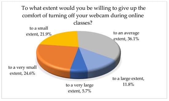 As can be seen from the figure below (Figure 8), by cumulating the response variants “to a very small extent” and “to a small extent”, we noticed that almost half of the respondents (46.5%) were not willing to give up the comfort of closing webcams during educational activities carried out in the online environment. More than a third of students declared themselves “to an average extent” (36.1%), the rest of the percentages represented the category of those who considered that they can keep webcams on during online classes.