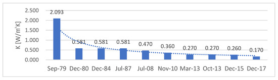 Since September 2013, the Korean government has expanded the scope of the energy saving plan submission. It is mandatory to submit an application to obtain a building permit with a floor area of 500 m2 or more, to change the use or report, or to change the contents of the building register. The energy saving plan of a building consisted of mandatory (21 items in the architectural, mechanical and electrical sectors) and recommendation aspects, along with the energy performance index (EPI) (40 items in the architectural, mechanical, electrical and renewable sectors). All the mandates were required to be met, and the recommendations required a score of 65 or higher (74 for public buildings) to obtain the approval of a building. Especially, insulation (one of different mandatory energy saving plans) has been strengthened the most so far because appropriate insulation can reduce the energy consumption by approximately 40% to 70% compared to non-insulation cases, depending on the region and climate [4,5]. The basic points (21–34) of the average thermal transmittance of the wall were allocated the largest proportion of the total points in the recommendation section. Thus, the applicant was encouraged to maintain a high insulation performance. The standard for the heat transmission rate of building sites by region was divided into four climates and applied accordingly (the divisions for the climate were increased from three to four in September 2018). Buildings in a higher latitude required a higher insulation performance. Figure 1 represents the insulation criteria for the external walls of non-residential buildings in the Korean Peninsula, in the central region. The x-axis indicates the revision year, and the y-axis shows the legal thermal transmittance criteria. The heat insulation criteria have become more stringent with time. Currently, Korea’s standard for thermal transmittance has been revised to the level of passive house.