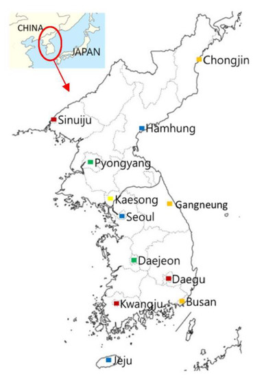 The Korean Peninsula is situated in the temperate climate zone of the mid-latitude region and exhibits four distinct seasons: spring, summer, fall and winter. Winter is cold and dry and influenced by the dry continental high pressure. In summer, the hot weather is affected by the hot and humid North Pacific high pressure. Spring and fall show many clear and dry days due to the influence of the migratory anticyclone. The geographical information and detailed weather characteristics of each region of the Korean Peninsula are summarized in Table 2, according to the Korea Meteorological Administration data [28] and a literature survey [29,30,31,32].