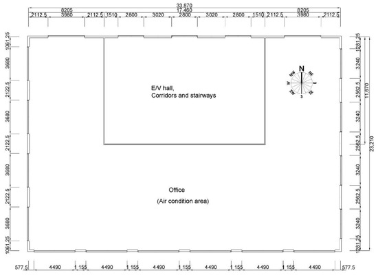The simulation buildings were selected as medium-sized standard buildings for non-residential work facilities [33], as extracted from the 2019 Energy Efficiency Rating DB Analysis (2016–2018). The selected standard building has a floor area of 6147 m2, five stories above ground, two basement floors with reinforced concrete and a southward-facing orientation. The details of the building are presented in Figure 4 and Table 3. Figure 4 is a simplified zone layout for the middle floor based on the standard model of reference [33]. The zone ratio is given in Table 3. For the zone ratio in Table 3, others include spaces for the office occupants, such as restrooms, rest area, etc. The first floor usually houses generally convenient facilities for the neighborhood.