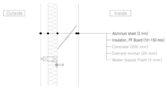 The external wall structure is based on the reinforced concrete structure of the standard building. The external wall finish reflects the exterior insulation finishing system and involves an aluminum sheet finish. Currently, such buildings are widely used as non-residential office facilities in Korea. The detailed composition of the external wall structure is illustrated in Figure 5.