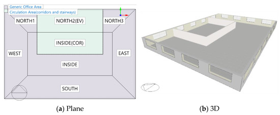 The influence of the surrounding buildings affects the heating and cooling loads of buildings. However, it was difficult to generalize this effect, and it was not reflected in this study. Moreover, because the simulations were conducted considering the middle floor of the building, the upper and lower floors were set as adiabatic. Figure 6 show the 3D modeling of the simulated space.