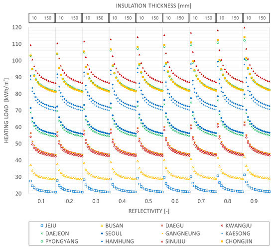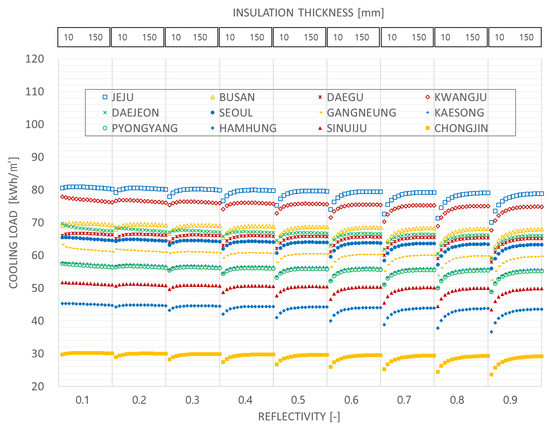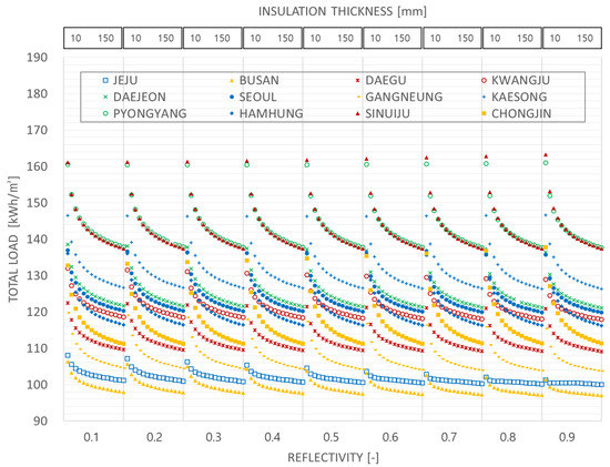 To delay fossil energy depletion and implement the Paris Climate Change Accord, the South Korean government is attempting to reduce greenhouse gas emissions with the establishment of the 2030 Roadmap. The insulation performance of external walls is being continuously enhanced in the architectural domain. However, Korea’s policy and construction market focuses only on the heat resistance of buildings’ external walls to enhance the insulation performance, leading to an increased thickness of the insulation materials. In this study, the relationship between the surface reflectivity and insulation thickness of external walls was examined to formulate an effective insulation strategy for buildings in Korea. Office buildings of 12 regions in the Korean Peninsula were considered. The dynamic energy simulation program EnergyPlus was used to perform the heating and cooling load analyses. The present worth method was adopted to perform the economic analysis. The analysis of the cooling and heating loads indicated that a change occurred not only in terms of the latitude but also between the Eastern and Western regions. The energy consumption could be reduced by increasing the reflectivity in the Southern region and lowering the reflectivity in the Northern region, based on the total load. In addition, a higher latitude corresponded to a higher energy saving effect owing to the increased insulation thickness. In the case of Jeju Island and Busan, regions with a relatively large cooling load and small heating load, the total load is little affected by insulation thickness at high reflectivity. If the external skin was considered to have the optimal reflectivity, the regions for optimal insulation thickness could be divided into three categories: north, central and south.
