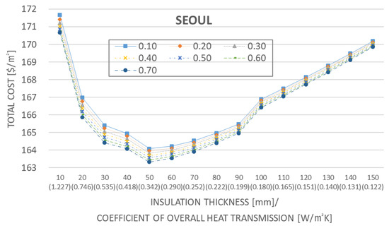 The cost survey of insulation and reflective materials was conducted considering the Korean architectural market. The costs included material and labor. Specifically, the survey was conducted based on the information of commodity prices, Korea’s price information and company estimates, and the lowest price among these aspects was selected. In addition, the advice of a construction specialist was sought to obtain a unit cost of the external wall construction.