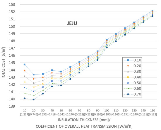 Et can be obtained as the sum of the cost of cooling energy per unit area and heating energy per unit area per year (Equation (5)). The cost of cooling energy per unit area per year was calculated by multiplying the annual cooling energy consumption (Ec) per unit area, calculated by an energy simulation, and the 2020 Korean electricity fee (summer) (Fs). The annual heating energy cost per unit area was calculated by multiplying the annual heating energy consumption (Eh) per unit area, calculated by an energy simulation, and the 2020 Korean electricity fee (winter) (Fw). The annual cooling and heating energy consumption per unit area were calculated through the simulation by reflecting the cooling and heating coefficient of performance (COP) of the EHP according to the demand for heating and cooling.