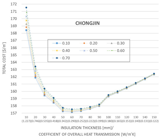 The research on exterior walls has been primarily focused on determining the optimal insulation thicknesses for each region and use case worldwide [13,14,15,16,17,18,19,20,21,22,23,24,25,26,27]: Ozel [15] studied the optimal insulation thickness for structural materials on the southern walls of buildings in Turkey. Dynamic simulations were performed considering five structural materials (concrete, briquet, brick, blokbims and autoclaved aeration) and two insulation materials (extruded polystyrene (XPS) and extended polystyrene (EPS)). In addition, an economic analysis of the energy consumption costs (10 years) was performed to determine the optimal insulation thickness. The optimal insulation thickness was 2–8.2 cm, leading to energy savings of 2.78 to 102.16 $/m2 and payback periods of 1.32 to 10.33 per year. Daouas et al. [18] determined the optimal insulation thickness of the external wall of a Tunisian building. The most profitable specifications corresponded to stone/brick sandwich walls and foam polystyrene as the insulation material, and the optimal insulation thickness was 5.7 cm. Wati et al. [19] examined the effects of external shading on the optimal insulation thickness of building walls in tropical areas. Increasing the shading reduced the optimal thickness, which was dependent on the directions. For each 1% reduction of solar radiation, the optimal insulation thickness was reduced by 0.035–0.036 cm in the south, east, and west regions, and 0.029 cm in the north.