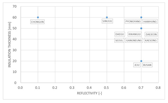 Furthermore, only a few studies attempted to analyze the cooling and heating loads through the external walls by correlating the reflectivity and insulation thickness: Ouarda Mansouri [26] investigated and analyzed the reflective coating effect and performance of external walls of residential buildings in the Mediterranean climate zone of Algeria with the TRNSYS analysis program. The results showed that the presence of insulation combined with a high solar reflectivity positively influenced the indoor air, thermal comfort levels and energy efficiency, providing a better environment for residents. The optimal combination corresponded to a wall of light-colored coatings with an albedo higher than 0.5 with insulation. Yuan [27] investigated the optimal reflectivity and insulation thickness by region in Japan. Based on the Japanese architectural market and economic analysis data, Yuan analyzed the changes in the cooling and heating loads according to the insulation thickness and reflectivity of each region and derived the optimal combination of the insulation thickness and reflectivity by region considering the cost. The results were Naha 0–10 mm, 0.7–1.0; Fukuoka 50 mm, 0.5–0.6; Osaka 60 mm 0.5–0.6; Nagoya 60 mm, 0.5–0.6; Tokyo 70 mm, 0.4–0.5; Sapporo 100 mm, 0–0.1. In this work, the study of Yuan was referenced, and the differences between this work and Yuan’s research are summarized in Table 1.