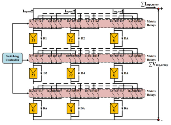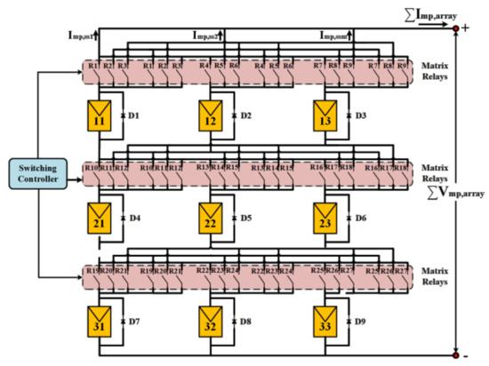 | [35] | Total Cross Tied (TCT) 3 × 3 array size | Bubble sort of modelbase with an adaptive bank and fixed part | This paper implemented an adaptive reconfiguration scheme for the reduction of shading’s negative effects. A switching matrix controller connects the adaptive solar bank and a fixed part of the PV module arrays to increase the output power production in real-time. |