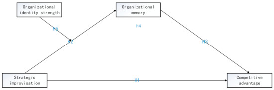 Recent works point out that improvisation is a form of a real-time organizational learning activity [16,17], and it is performed in daily interactions [18,19]. Yet as a set of skills that can be trained by organizational leaders [20,21], little is known how it should be learned and what facilitates the process so as to lead to better performance. Alining with prior works, we adopt a learning perspective to understand SI as novel actions utilized by top managers or funding teams spontaneously to respond to unforeseen events using resources at hand under time pressure. We unpack the black box between SI and competitive advantage by proposing a moderated mediation model. From a knowledge-based viewpoint, we investigate a mediating role for organizational memory in the relationship between SI and competitive advantage. Second, based on situated learning theory, we explore the moderating effect of organizational identity strength, defined as how strong organizations hold their identity in this mediated relationship.