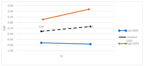 We predicted that OIDS positively moderated the relationship between SI and OM, yet empirical results (Table 9) demonstrated otherwise. Model M7 showed that after adding SI*OIDS into model M6, the effect was not significant (β = 109, p > 0.05). This means that H5 is unsupported.
