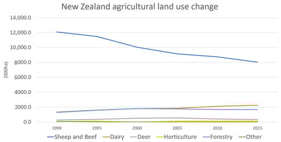 Changes in agricultural land use activity in New Zealand from 1990–2015. [51].