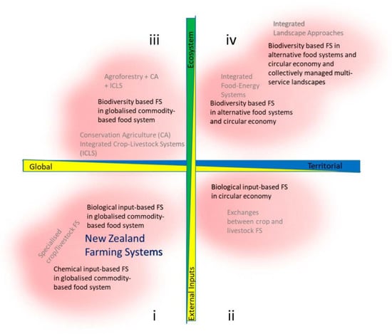 When considering alternative farming systems, Therond et al. [53] classify models of agriculture to the degree to which the biotechnical functioning of agriculture is based on ecosystem services versus external inputs and the degree to which their relationship with socio economic contexts are based on global market prices versus territorial embeddedness. Table A1 and Table A2 in Appendix A, outline the characteristics of alternative systems across these dimensions as classified by Therond et al. [53]. Using this approach they identify six broad classifications of farm systems across these dimensions as highlighted in Figure 2. On the basis of these dimensions, it would seem reasonable to place the majority of New Zealand systems in the bottom left quadrant of Figure 1. That is, they operate generally in a globalized commodity-based food system and whilst intensity does vary between chemical and biological based inputs, in general they sit between the two.