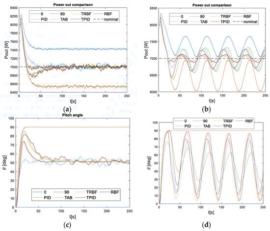 As expected, when the wind profile is random, the pitch angle is slightly noisier if the lookup table is used (TAB, TPID, and TRBF control configurations). This may be due to the fact that the wind, which is the input to the table, introduces noise. The strategies that do not depend directly on the wind to obtain the pitch reference (0°, 90°, RBF, and PID) are less sensitive to noisy wind. Indeed, it is possible to see that the noisiest pitch angle occurs with the TAB control configuration, as neither the RBF network nor the PID regulator which smooths the pitch reference is applied. On the other hand, the sinusoidal shape is observable in the pitch angle when the wind has this sinusoidal profile.