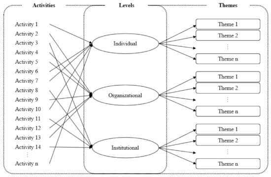 Referring to the literature that suggests the levels of activities at the CSR–HR intersection (e.g., [,]), we devised a research framework in which all the HR-related activities (i.e., items) were matched with the corresponding levels and therein converged into higher-order themes for conceptualization (Figure 1).