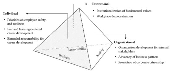 As depicted in Figure 2, the content analysis and inductive conceptualization of the HR-related activities of DJSI-listed MNEs produced a triangular pyramid for socially responsible HR constructed with major themes at the individual, organizational, and institutional levels.