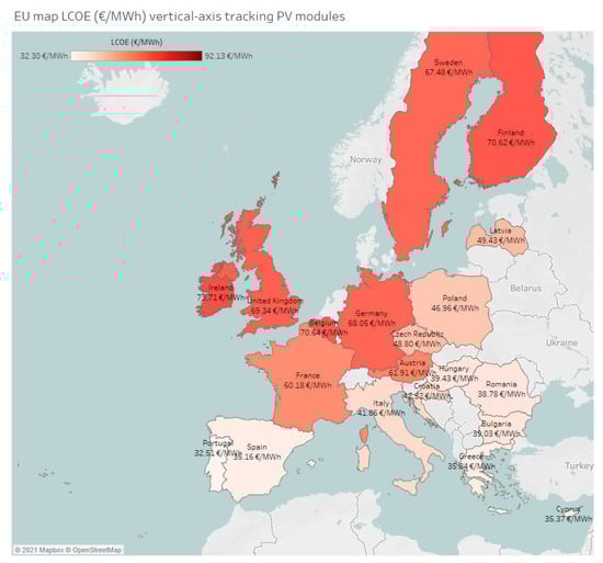 EU map LCOE (EUR/MWh)—vertical-axis tracking PV modules (source: own elaboration with Open StreetMap layer [46]).